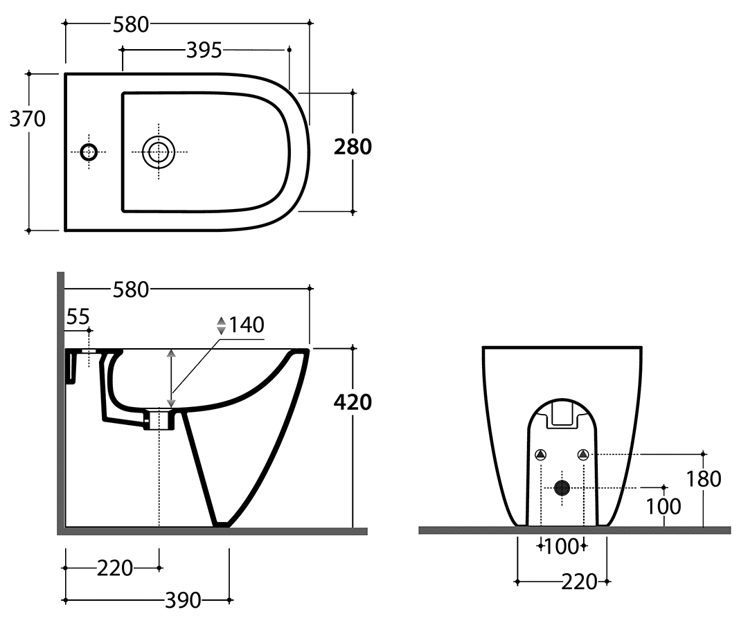Напольное биде с переливом и отверстием под смеситель. Установка вплотную к стене. Крепление к полу входит в комплект.