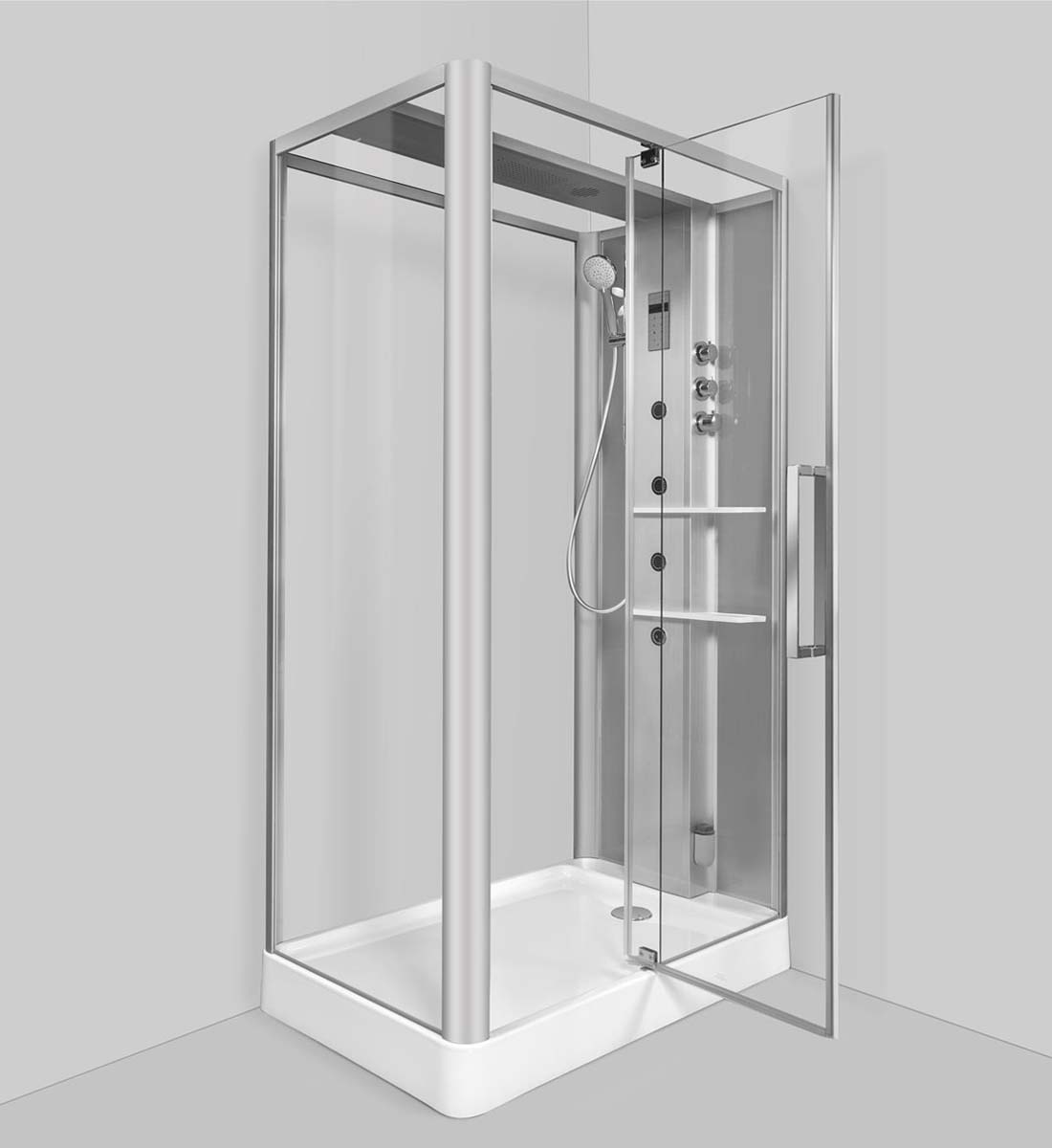 Гидромассажная душевая кабина с турецкой баней. Смеситель с термостатом оснащен функцией Non-Stop, а оптимальное место расположения смесителя делает его удобным в использовании для людей любого роста. Удобная внутренняя эргономика душевой кабины, большой размер и отсутствие массивных задних стенок делают внутреннее пространство особенно комфортным. Универсальная версия для лево- или правостороннего монтажа. Практически прозрачная конструкция душевой кабины (включая стеклянную крышу) не скрадывает пространство ванной комнаты. Профиль из анодированного алюминия и закалённое стекло толщиной 6 мм обеспечивают прочность конструкции. Душевая кабина оснащена: верхним и ручным душами, 4-мя боковыми форсунками, светодиодной подсветкой, радиоприёмником и паровой баней с сенсорным пультом управления. На центральной стойке расположены две вместительные полочки из литьевого мрамора.