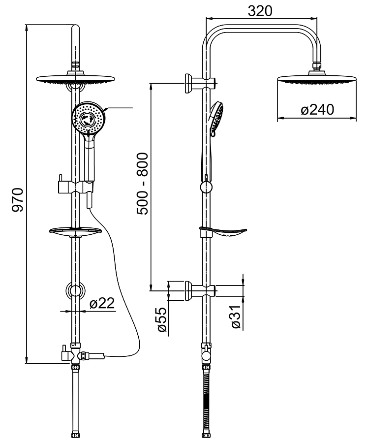 Душевая система с переключателем (без смесителя). Подключается к внешнему или встроенному смесителю для душа или к смесителю для ванны. Пластиковый верхний душ Ø240 мм, ручной душ с 3-мя режимами струи, душевой шланг длинной 1,50 м в металлической оплётке, регулируемый по высоте держатель ручного душа. Душевая стойка 970 мм из латунной трубки Ø22 мм.