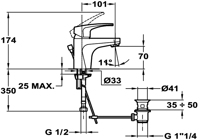 Однорычажный смеситель для раковины с донным клапаном, керамический картридж, антиизвестковый аэратор, подключение - гибкая подводка 1/2"x350 мм.