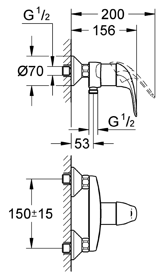 Однорычажный смеситель для душа. Керамический картридж GROHE SilkMove® диаметром 46 мм с возможностью регулировки расхода воды, обратный клапан в душевом отводе 1/2". Хромированная поверхность GROHE StarLight®. Расход воды при давлении 3 бара приблизительно 18 л/мин, рекомендуемое рабочее давление 1 - 5 бар.