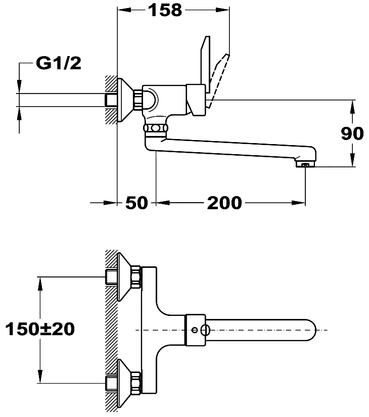 Однорычажный настенный смеситель для кухонной мойки. Керамический картридж, поворотный излив длинной 200 мм.