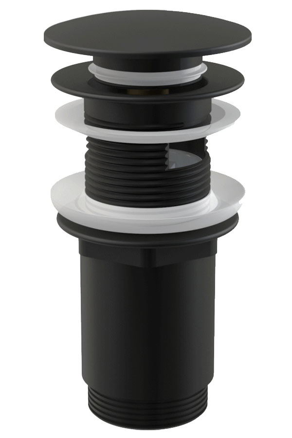 Сливной выпуск для раковин с переливом. Донный клапан с механизмом Click-Clack (открывание и закрывание слива нажатием на декоративную крышку). Подходит для сифонов с резьбовым соединением G1-1/4". Материал слива - высококачественная латунь, окрашенная матовой чёрной эмалью.